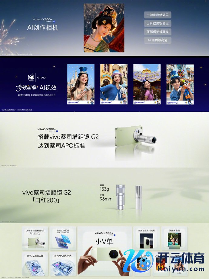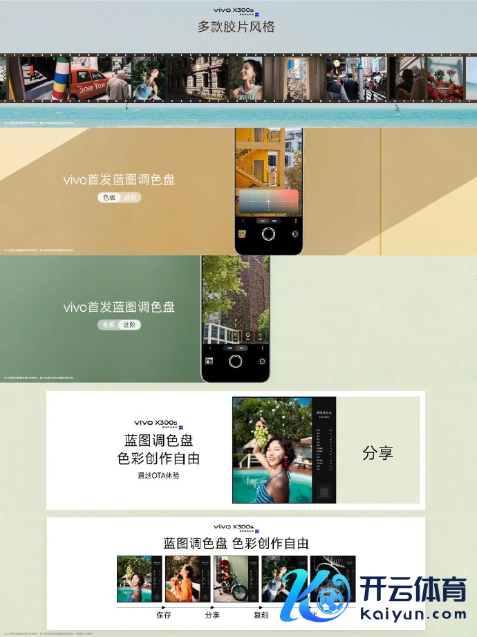 影像方面,X300s后置蔡司2亿像素主摄(1/1.4英寸HPB,CIPA 4.5级防抖)与蔡司APO超等长焦,搭载蓝图影像芯片V3+(蓝晶×天玑9500)。解救X300 Ultra同款全焦段变焦闪光灯及闪光东说念主像算法。提供十余种胶片格调,新增“追光”“浓郁”两种格调,解救蓝图调色盘。首发AI创作相机,解救一键出片及4K画质。